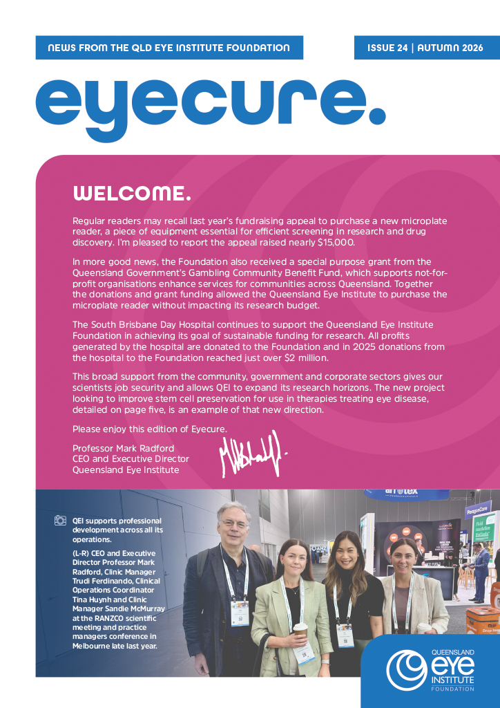 The Queensland Eye Institute Foundation publishes Eyecure, a newsletter featuring updates in QEI’s research, education and fundraising activities.